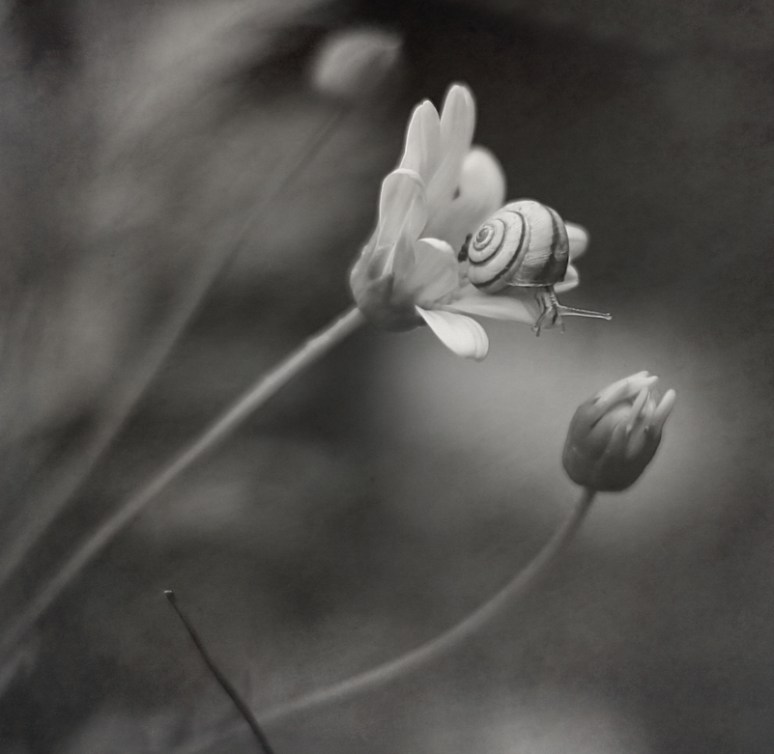 1. Preciosa toma, ya echaba de menos alguna de tus delicatessen. El caracol le da un valor añadido a lo que ya era una bonita fotografia. Me queda la duda de ver esta toma en color, sospecho que tiene que ser tambien muy atractiva.